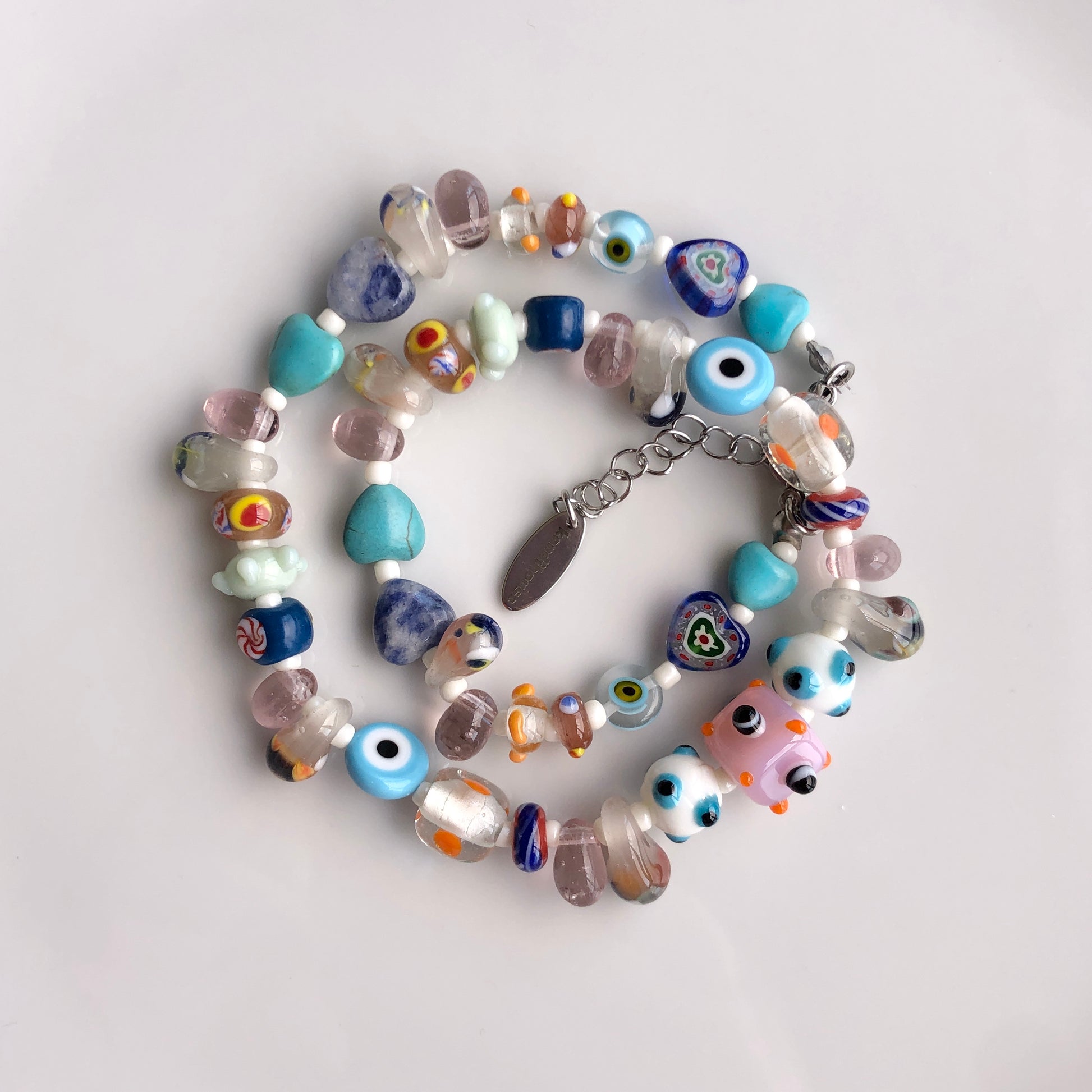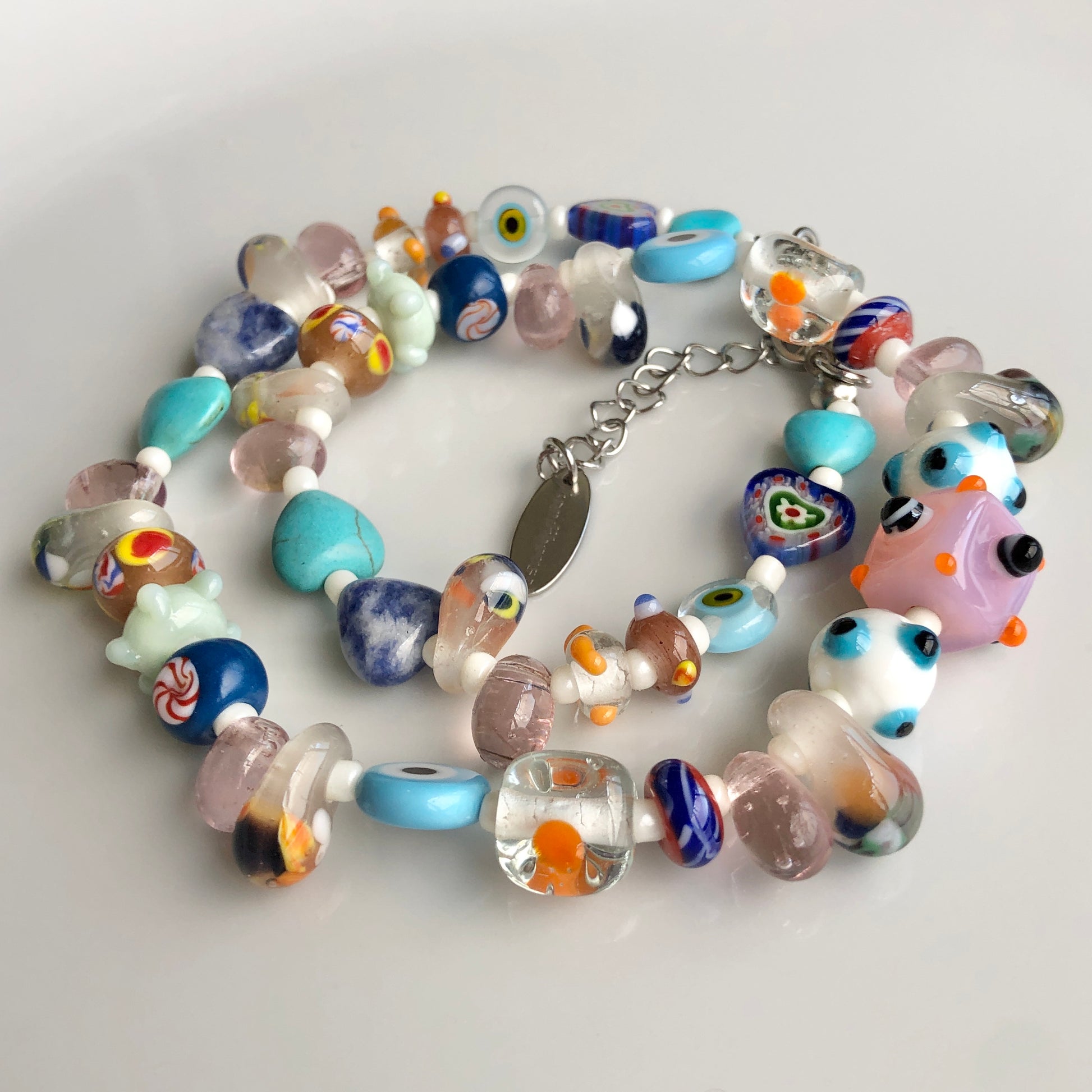 ガラスビーズ(とんぼ玉)、天然石、シードビーズの一点物ハンドメイドネックレス♪