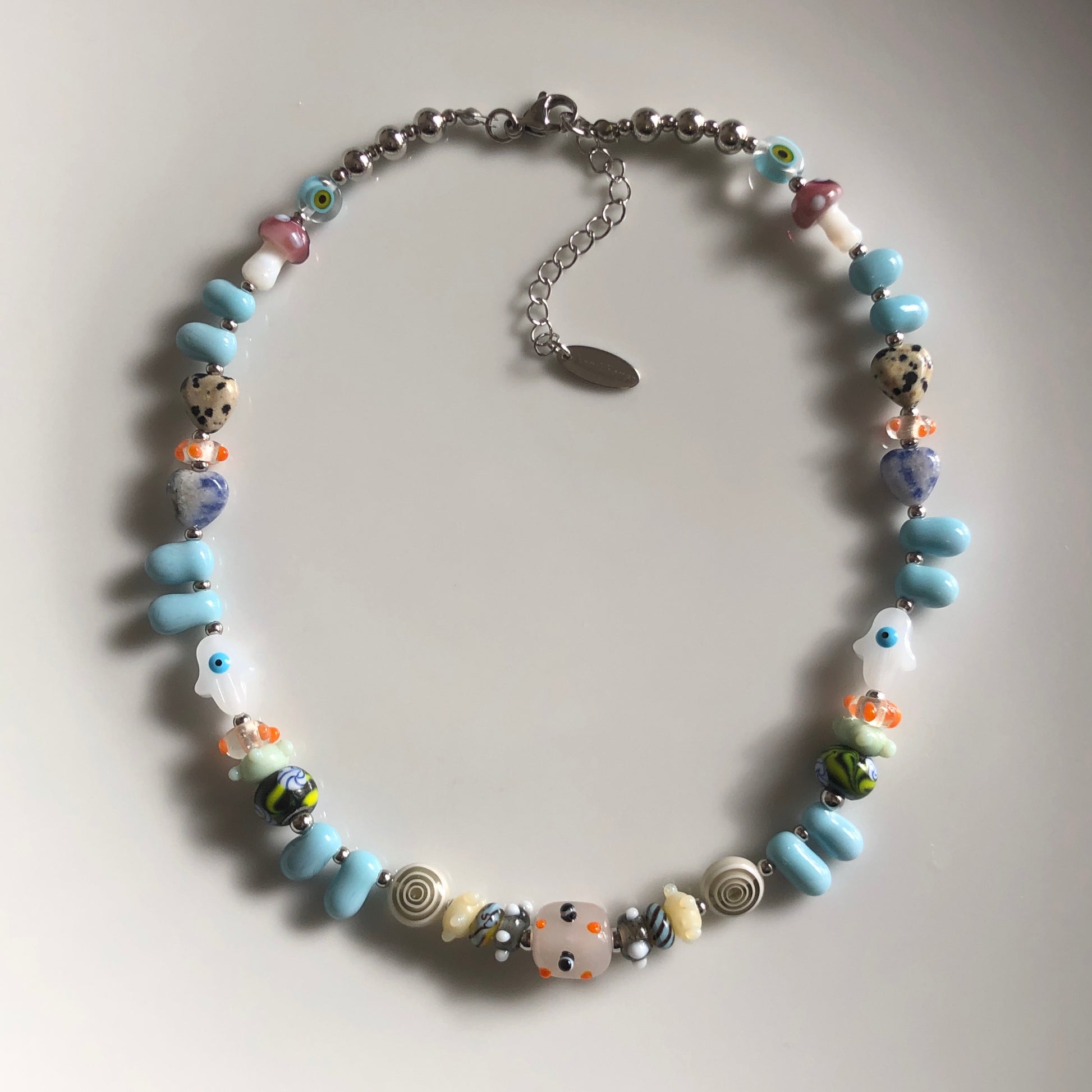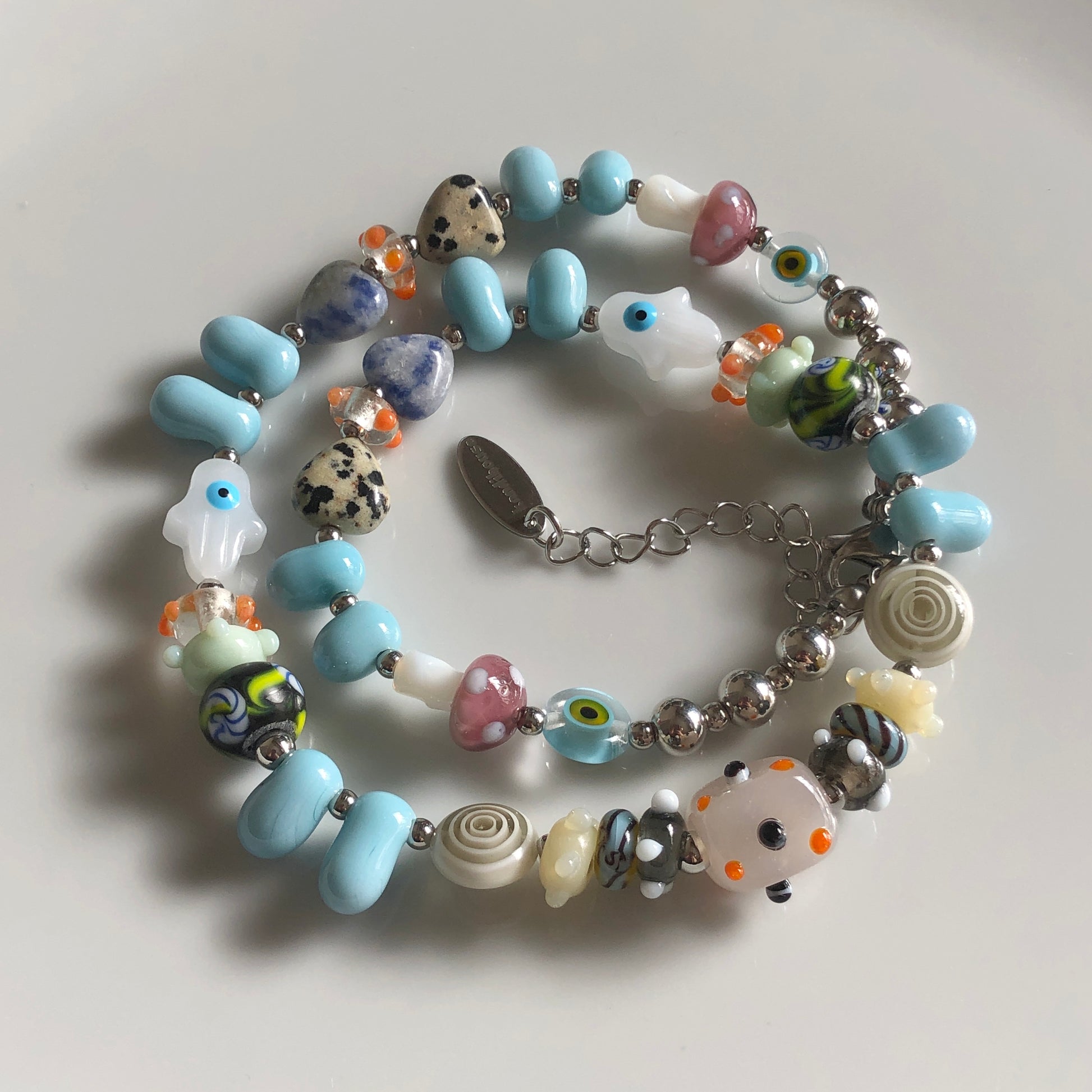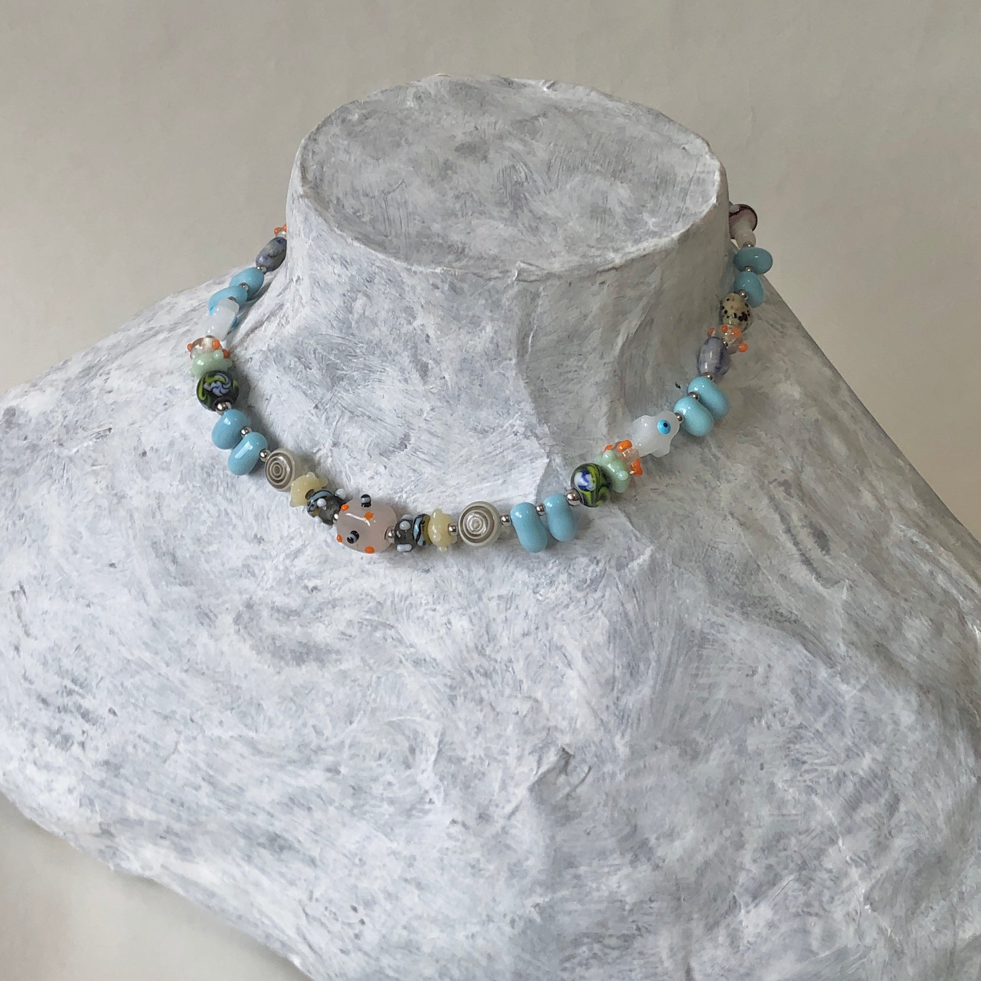 A unique handmade necklace with randomly arranged glass beads, natural stones, metal beads, etc.♪