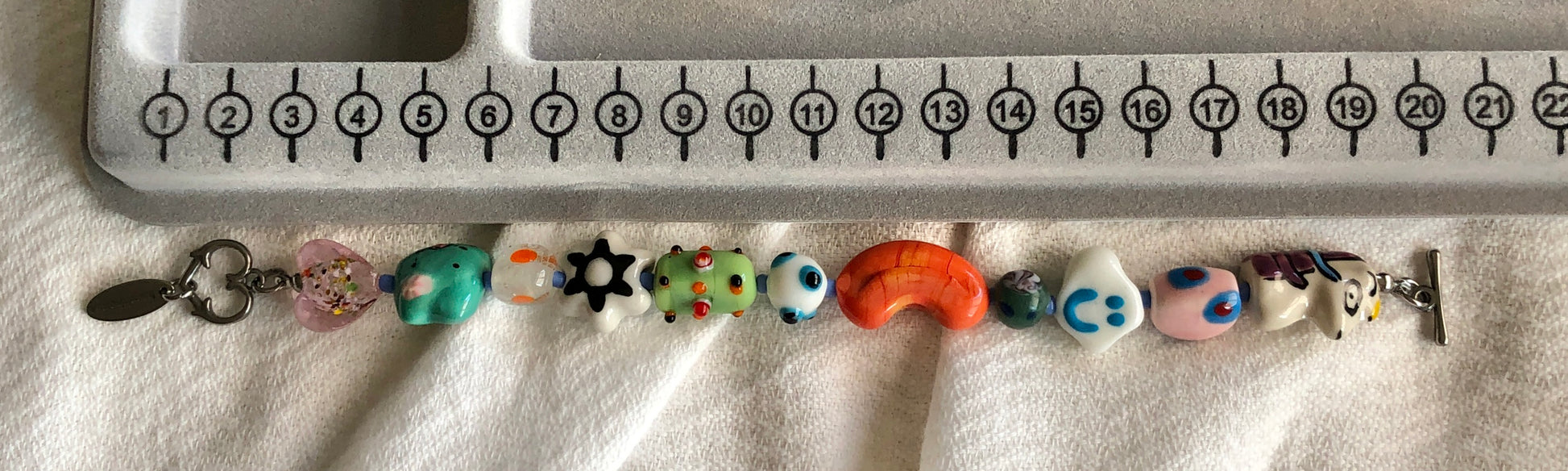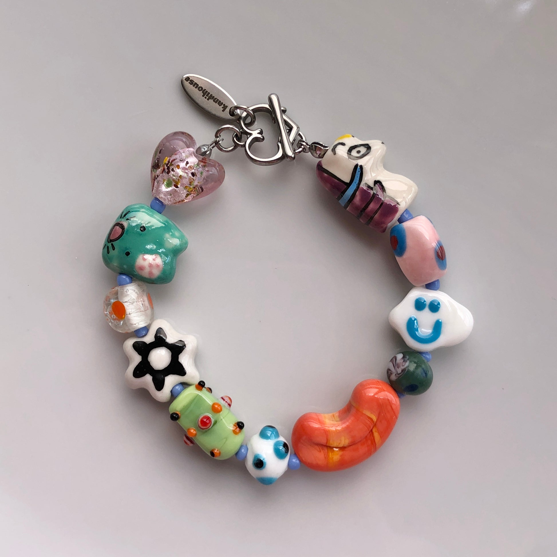 とんぼ玉などのガラスビーズと陶器ビーズを使用して、ユニコーンやネコなど可愛いモチーフのビーズを組み合わせたハンドメイドのブレスレットです。