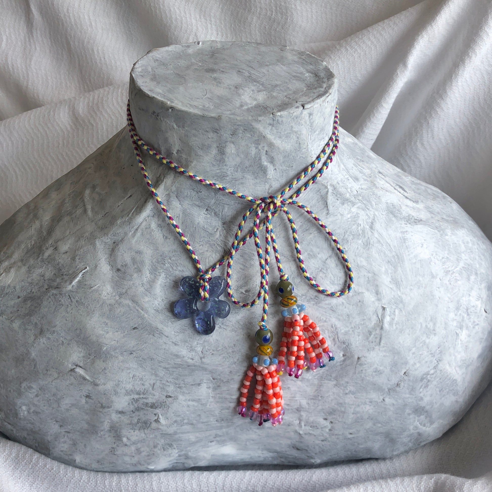 素材: コットン紐、ガラスビーズ、ガラスチャーム