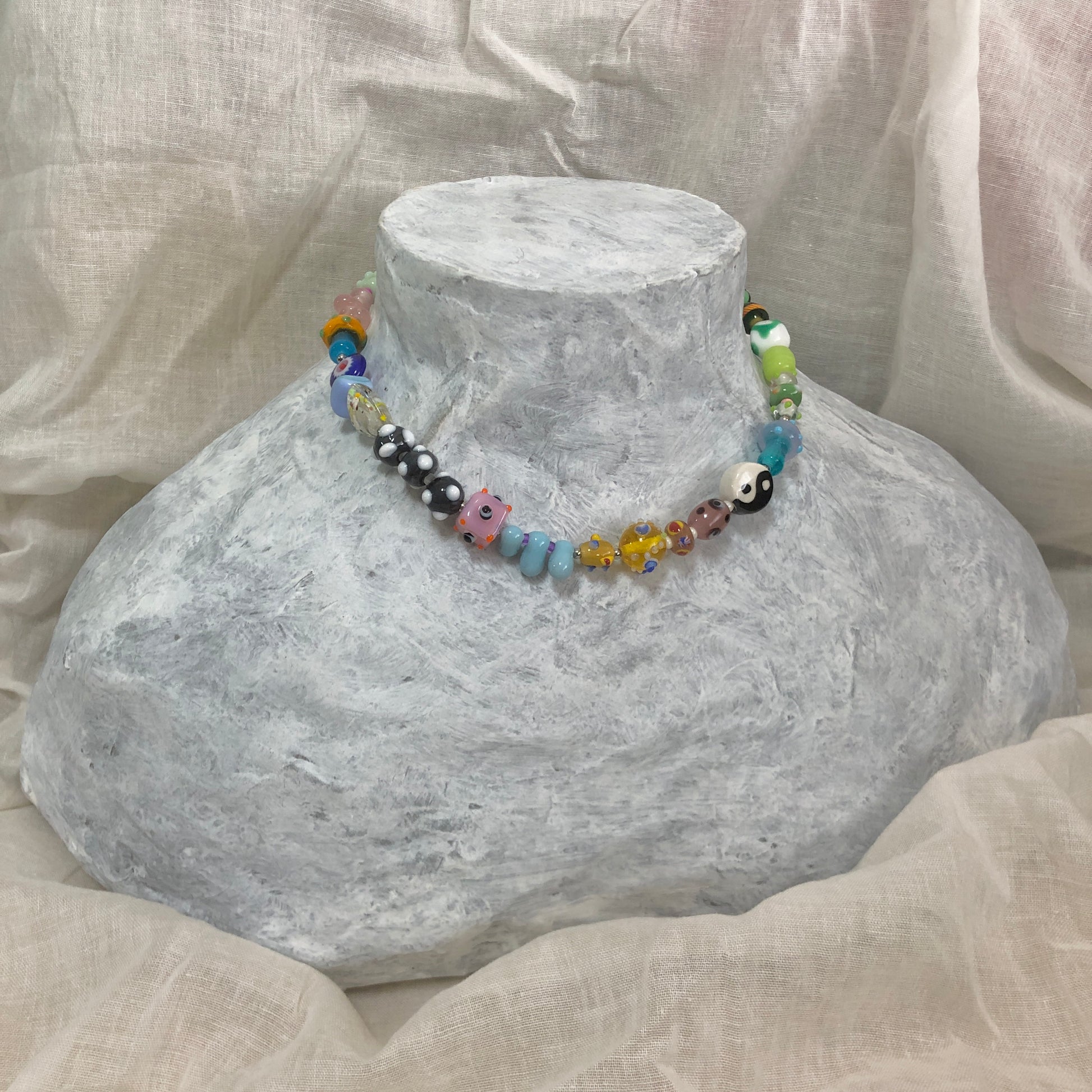 ガラスビーズ(とんぼ玉)、陶器ビーズ、メタルビーズ、シードビーズの一点物ハンドメイドネックレス♪