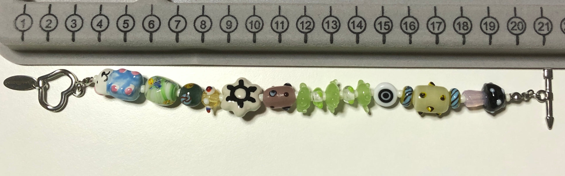 とんぼ玉などのガラスビーズと陶器ビーズを使用して、きのこやクマなど可愛いモチーフのビーズを組み合わせたハンドメイドのブレスレットです。