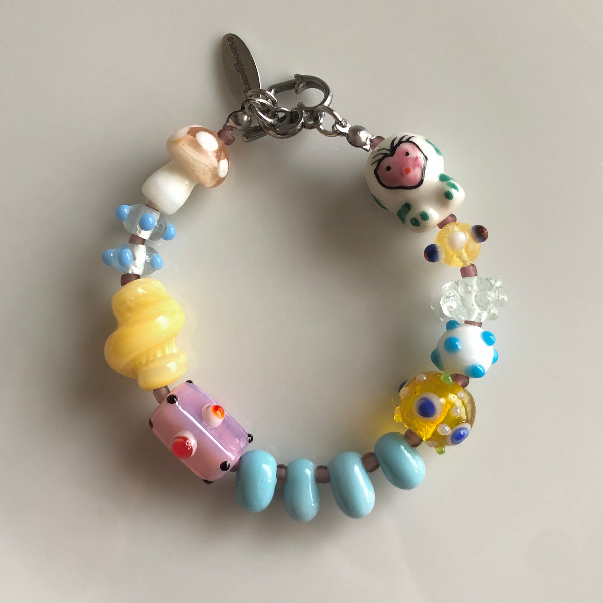 とんぼ玉などのガラスビーズと陶器ビーズを使用して、お猿やキノコなど可愛いモチーフのビーズを組み合わせたハンドメイドのブレスレットです。
