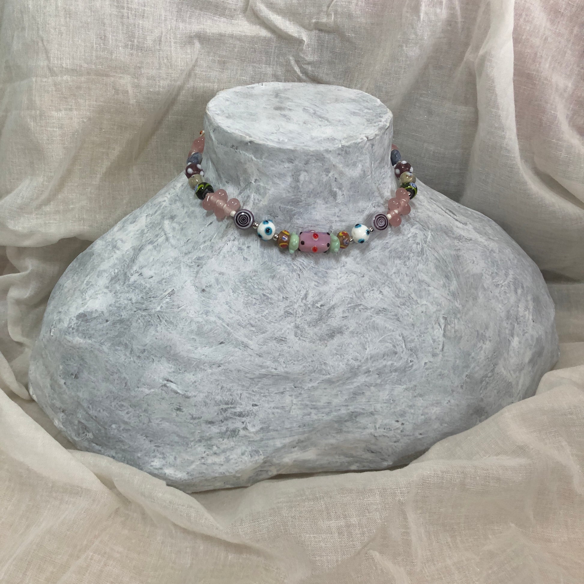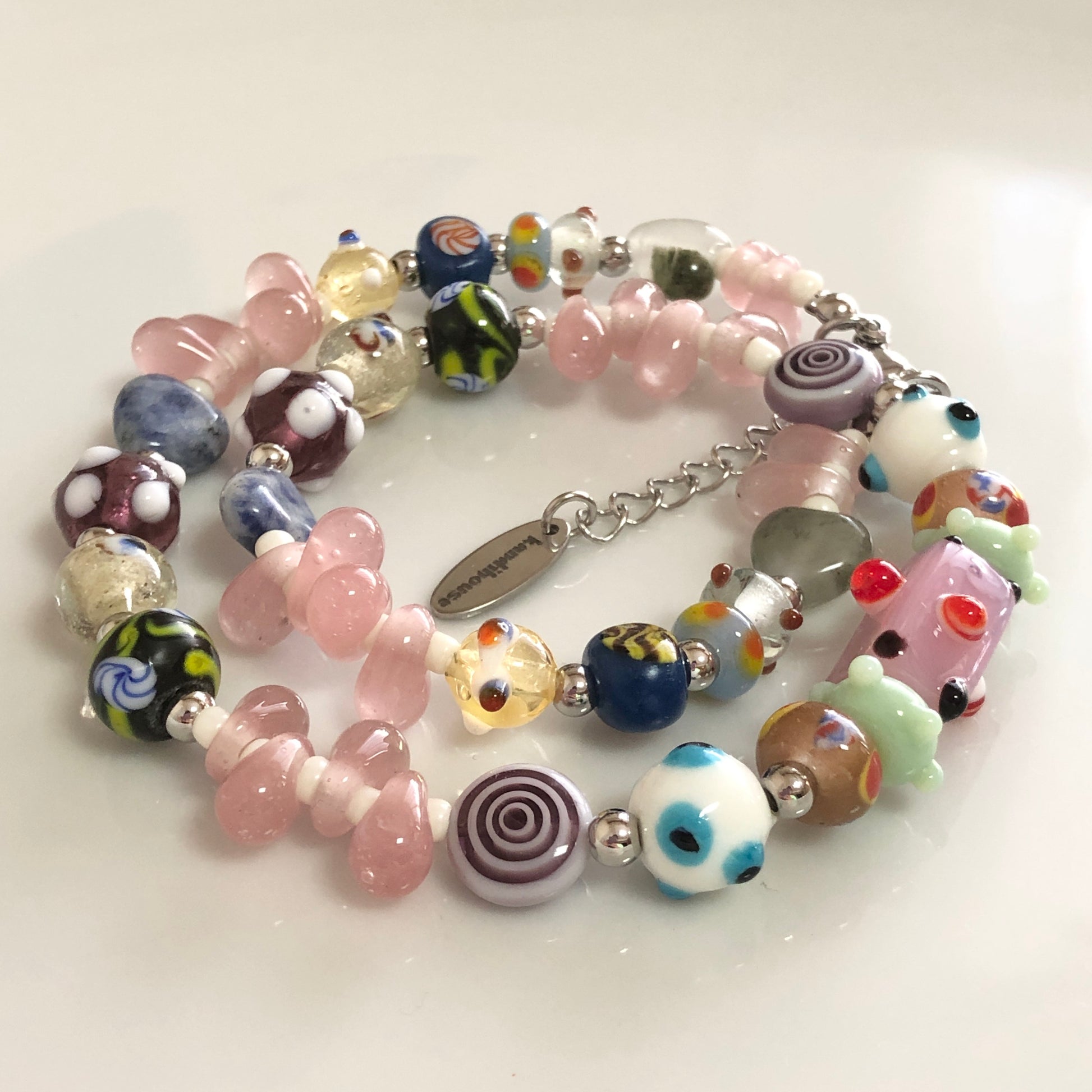ガラスビーズ(とんぼ玉)、天然石ビーズ、メタルビーズ、シードビーズの一点物ハンドメイドネックレス♪